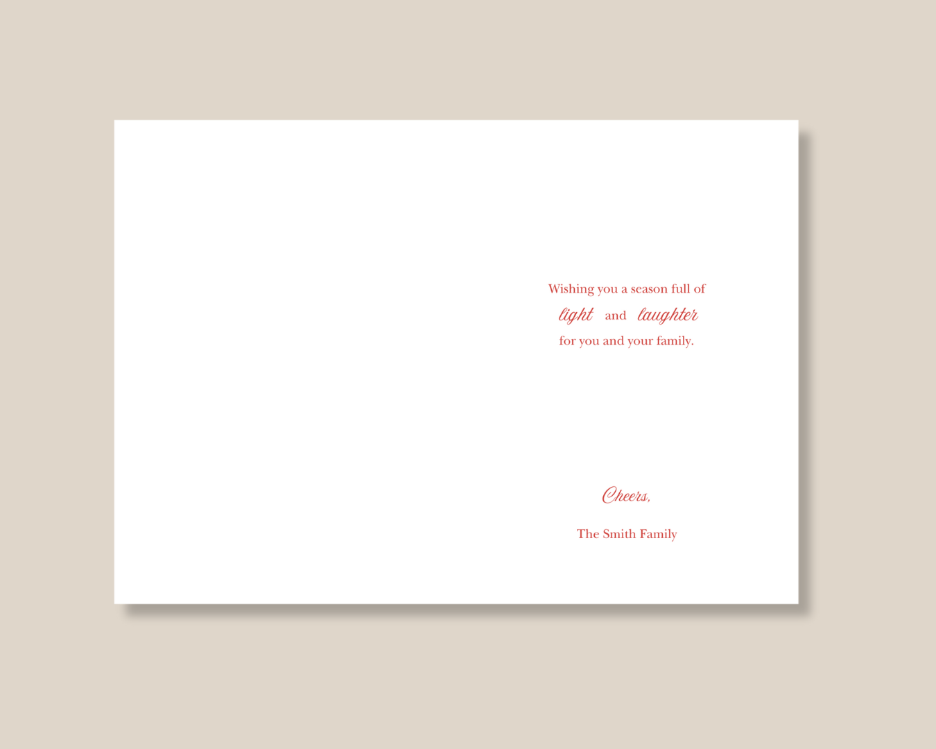 Spread holiday cheer with these personalized greeting cards, printed on premium 110lb Linen stock and paired with Forest Green or Vermillion envelopes. Add your family name for a custom touch—the pre-printed message inside makes sending warm wishes easy. Arrives beautifully boxed and ready to delight!